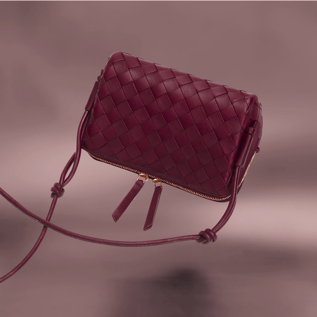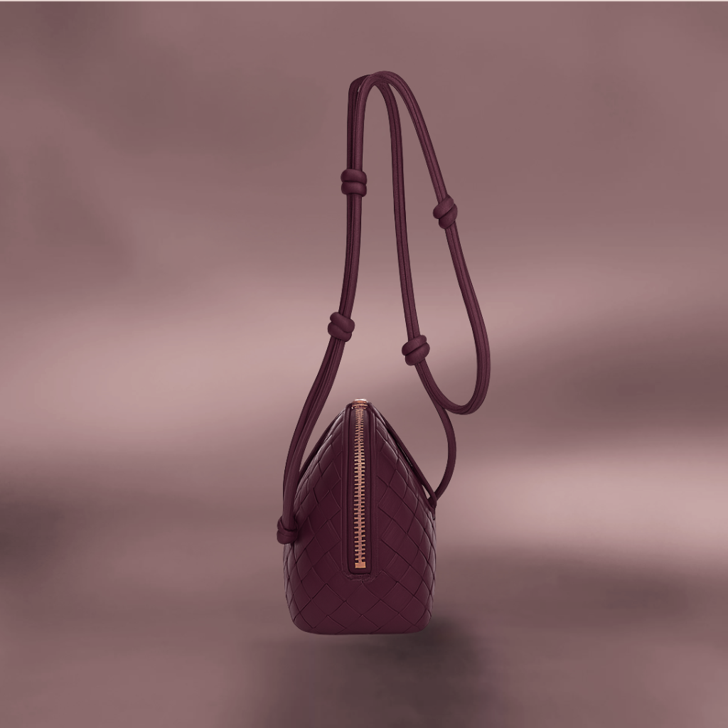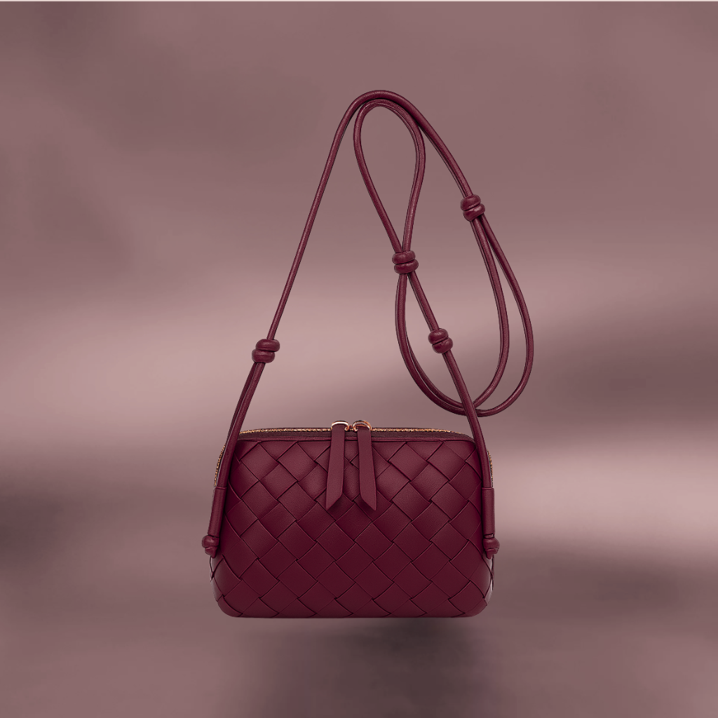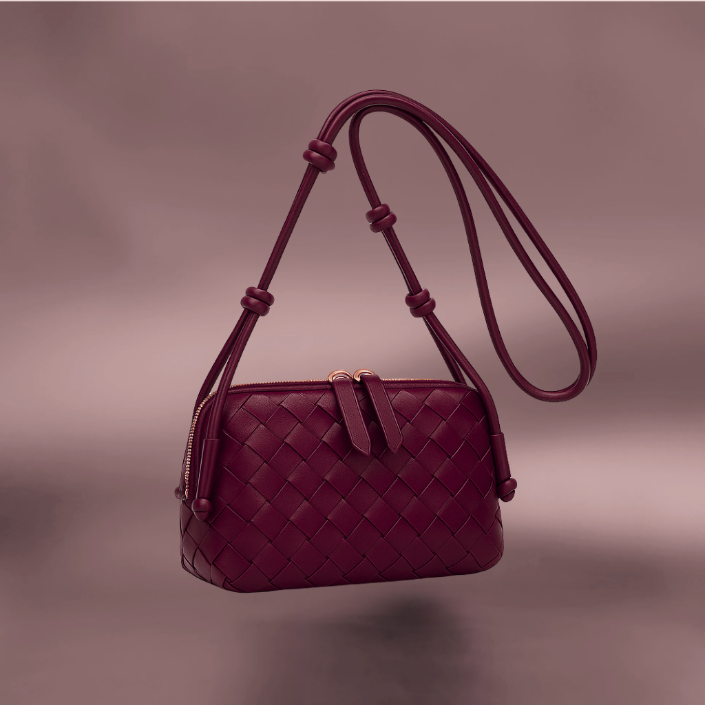 Finished in a wine hue, its structured yet supple form and light-gold dual zip exude effortless elegance. An adjustable knotted strap adds versatility, while the suede-lined interior offers understated practicality — where every detail whispers luxury
