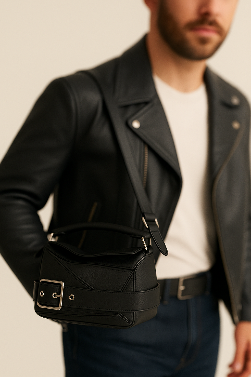 The So Puzzled bag is an impeccably crafted genuine leather piece featuring a belt and biker-inspired accents. Its versatile design suits both daytime and evening use, offering ample space to carry your essentials with ease. This statement accessory distinguishes you with its unique style and high-quality craftsmanship. A versatile bag that can be used a Top Handle, Shoulder or a Crossbody Bag.
